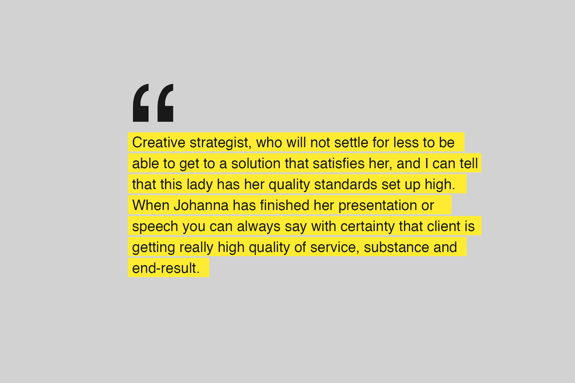 (Last edited 12/2019:) Specialised in creative planning, development, direction, facilitation, design and deployment in branding and marketing communication strategies and creative concepts in traditional, digital, social and content space. +15 years of awarded global, local and regional agency account directing, creative strategy planning and marketing management expertise in both B2C- and B2B-fields.